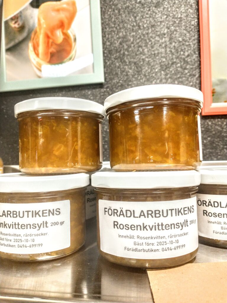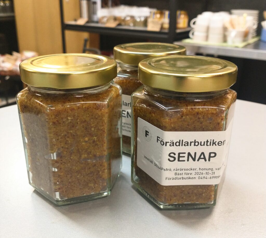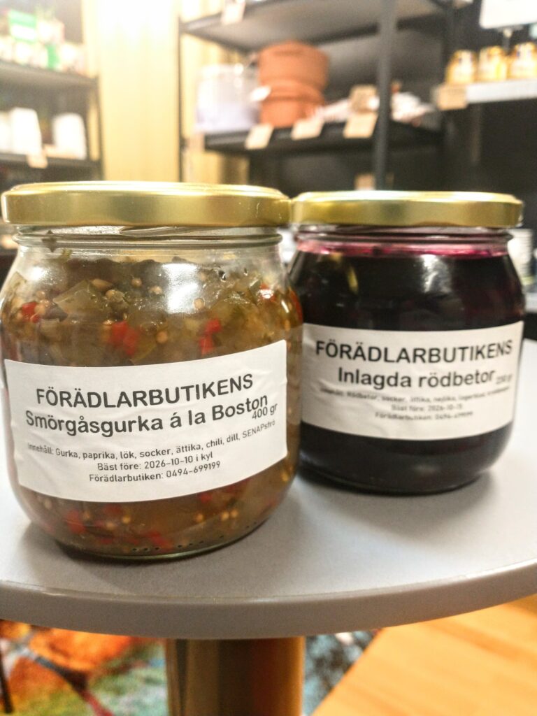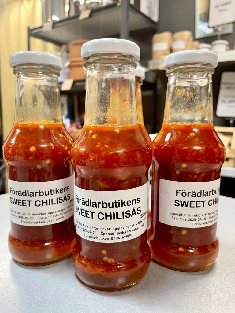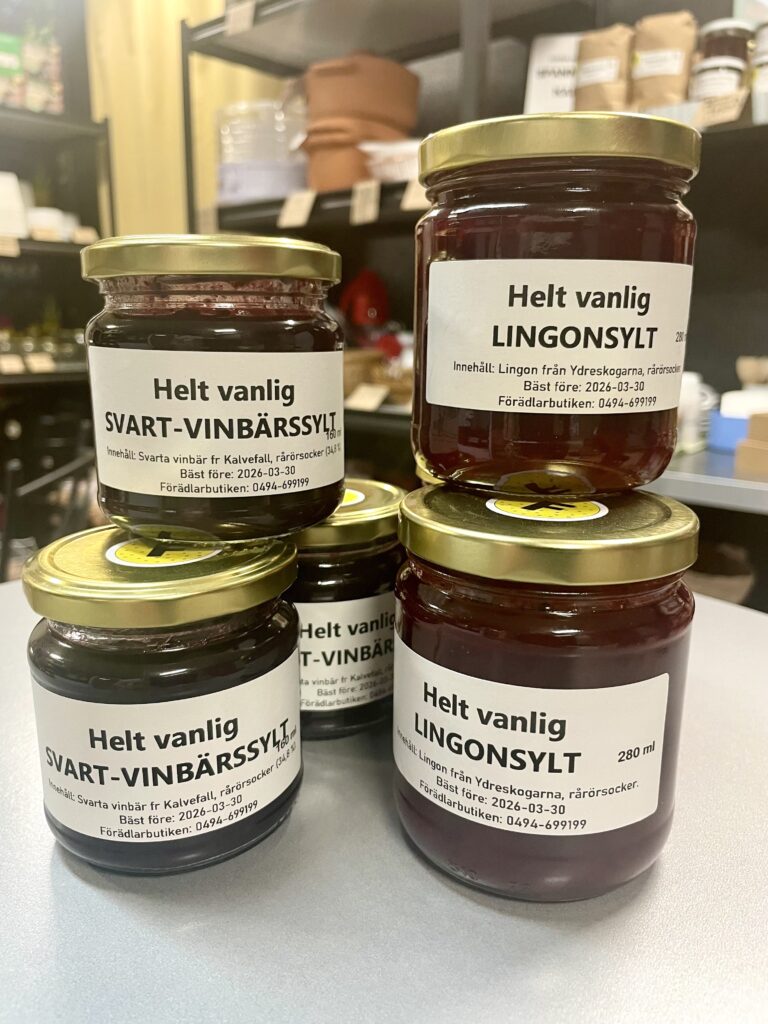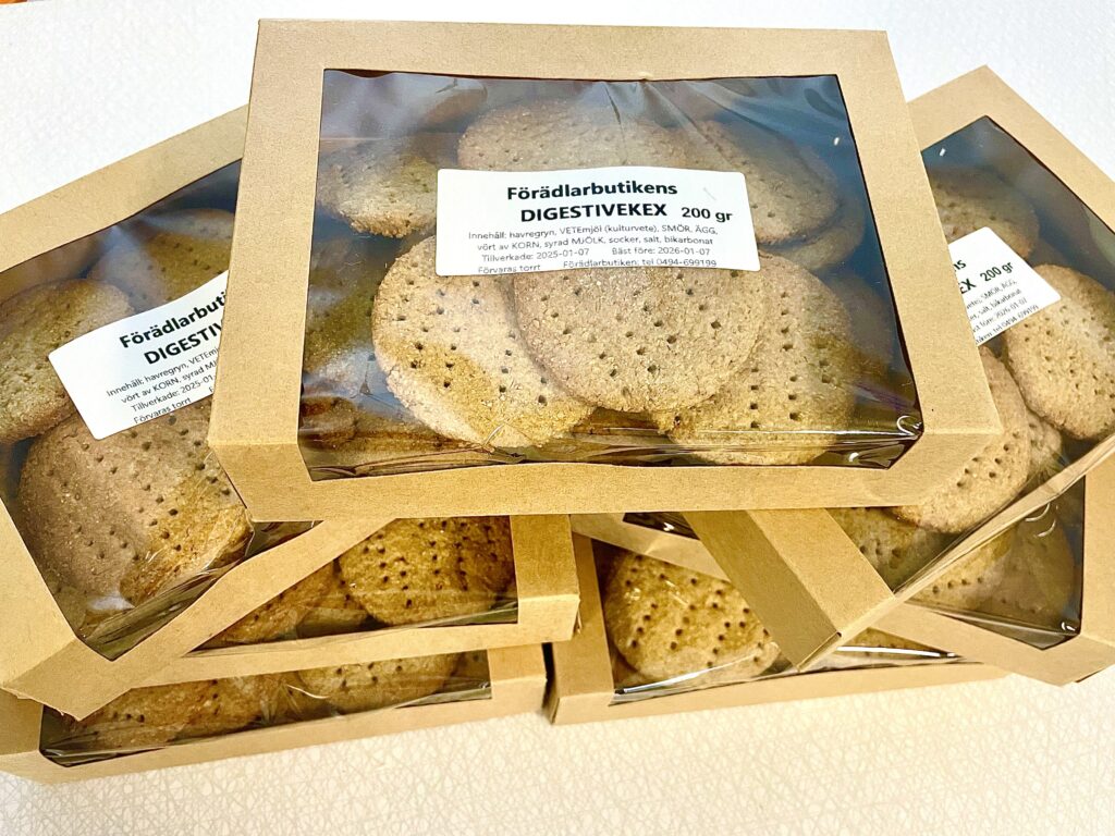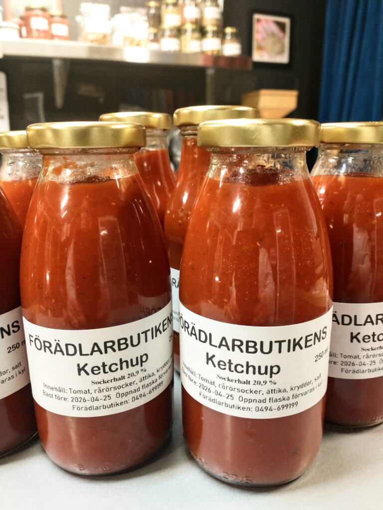 Vår goda ketchup är tillverkad av tomater från Varv i Motala. Ketchupen ska fungera som vanlig ketchup med alla dess användningsområden. Kryddningen är klassisk och enkel. Innehåll: Tomat, rårörsocker (ekologisk), ättika, kryddorkryddor. Yoghurten är gjord på mjölk från Tjärstad Boda Skattegård utanför Rimforsa, pastöriserad till 92 grader för krämig konsistens och sedan syrad med termofila mjölksyrebakterier. Påminner om långfil i känslan. Innehåll: MJÖLK, syrningskulturRosenkvitten plockade i Rimforsa. Rosenkvitten har en karakteristisk syrlig smak och passar bra till ost-och-kex. Innehåll: Rosenkvittenfrukt, rårörsocker (ekologisk)Vår saffranssirap har en svag smak av saffran och äpplemust, gott till pannkakor. Innehåll: Rårörsocker (ekologisk), äpplemust, saffranVår fikabrygd är till dig som vill slippa koffeinet och hitta en ersättning till kaffet. och är gjord av rostat korn. Vi har utvecklat en blandning av olika rostningsgrader för att få fram ett gott spannmåls-”kaffe”. Spannmål använde man som fikadryck förr när kaffe var en bristvara. Denna blandning bryggs i kaffebryggare med dosering 2 kaffemått per kopp. Innehåll: Rostat KORNVåra inläggningar är gjorda av grönsaker från giftfria odlingar i Östergötland/Rimforsa. Klassiska smaker av inlagda betor och smörgåsgurka. Innehåller utom grundråvaran: socker, ättika, ev kryddor.Vår pasta är tillverkad av ägg från Rimforsa och durumvetemjöl, inget tillsatt vatten. Den breda varianten passar till alla slags pastasåser och den smala är extra gott som nudlar i soppor och wok. Innehåll: Durumvetemjöl, ägg och lite saltVåra koncentrerade saftar är tillverkade av bär från trädgårdar i Kindabygden. Utbudet varierar med årstid och tillgång. Innehåll: Bär, ekologisk rårörsockerVår druvsaft är koncentrerad saft av egna druvor som är plockade efter frost för djupare naturlig sötma. Spädes 1 del vatten – 1 del saft. Innehåll: Gröna druvor, rårörsocker (ekologisk) Vår senap är gjord med vår egen äpplemust som vätska, vilket ger en pigg fruktighet i smaken. Den är grov och lagom sötad med honung och ekologisk rårörsocker och lagom stark. Råvaran är ekologiska senapsfrön från Skåne. Innehåll: SENAPsfrön, socker, honung, äpplemust, ättika, egen äppelvinägerVåra kryddblandningar av hela kryddor väger vi själva och blandar efter eget recept. De flesta kryddorna är ekologiska. Vi använder hela kryddor för att man ska kunna mala de färska när man lagar mat för kraftigare smak. Vi har följande blandningar: Curry, TexMex, Klassisk grill, italienska örter, brödkrydda Vår stekost är ystad på mjölk från Tjärstad Boda Skattegård utanför Rimforsa. Den är gräddig i smaken och inte överdrivet gnisslig. Går utmärkt att frysa och smälter inte på grillen. Ibland finns också ricottaost i butiken när vi gjort stekost. Innehåll: MJÖLK, löpe, syrningskultur, saltTanken med våra sylter av handplockade bär från Östergätland är att ta vara på råvarans egna smak och låta den glänsa. Vi experimenterar inte med olika kombinationer och krånglar inte till det, utan lingonsylten innehåller lingon och ekologisk rårörsocker och svart-vinbärssylten innehåller endast svarta vinbär och socker, endast två ingredienser. Vi använder inte heller syltsocker som innehåller syntetiska tillsatser (pektin, natriumbensoat) utan håller det rent. Vi håller även sockerhalten nere, ca 30% socker. Innehåll: Bär, ekol. rårörsockerVår fermenterade surkål är fräsch och knaprig i smaken, med fin lagom syrlighet, naturlig – inga tillsatta kryddor. Kålen kommer från ekologiska odlingar i Östergötland. Den fermenteras i okt-nov och behåller sin fina krispiga konsistens ända till mars-apr. Innehåll: ekologisk vitkål, salt.Vår jordgubbssylt är tillverkad av ekologiskt odlade jordgubbar från Tjärstad Boda Skattegård nära Rimforsa. Tillsatsfri och låg sockerhalt (ca 22%). Innehåll: Jordgubbar, ekologisk rårörsocker, ättikaVåra goda spröda digestivekex har vi skapat receptet för själva efter gamla beskrivningar om vad de skulle innehålla ursprungligen. Vi mäskar vört som bakvätska och maler själva gammeldags kulturvete odlad i Hasselås utanför Rimforsa. Kakorna har perfekt salt- och sockerbalans och fungerar fint till både ost-och-kex och till en kopp kaffe. Innehåll: Havregryn, kulturVETE Innthaler, vört av KORN, SMÖR, ÄGG, socker, saltTanken med vår goda sweet chilisås är att den ska kunna användas precis som den köpta, till kyckling, till wok mm, men har förstås godare och djupare smak än den industriellt producerade samt är tillsatsfri. Ursprunget till chilifrukterna, likaså styrkan i såsen, varierar beroende på årstid och tillgång. Innehåll: chilifrukt, ekologisk rårörsocker, vinäger, vitlök, majsstärkelseMjölksyrad opastöriserad äppelvinäger lagrad i 6 månader före flaskning, ner till pH 3,5. Mild, fräsch och lätt i smaken, passar till att ringla över sallader eller i vinägrett, eller bara ta en en liten sipp då och då. Eftersom den är opastöriserad så kan den användas som starter för egen ny vinäger. Innehåll: Äpple.Vi har alltid hembakta ciabattabröd i frysen som säljs i 4-pack, vetebrödet med lös deg och härligt luftig struktur. Innehåll: VETEmjöl, vatten, ekologisk olivolja, jäst, socker, saltJästlimpa av emmervete odlad i Hasselås, Rimforsa, med surdeg som smakhöjare. Innehåll: EmmerVETE, surdeg av emmerVETE, jäst, rapsolja, eko. rårörsocker, saltVi har alltid någon sorts sirap i sortimentet – rabarber, jordgubb, körsbär, beroende på årstid och tillgåmg. Sirapen är megagod att ringla över glass, våfflor eller pannkakor eller blanda i drinkar. Den har kvar syrlig smak av respektive råvara och är inte överdrivet söt. Naturligtvis kokar vi vår sirap alltid på ekologisk råvara från närområdet. Innehåll: Bär/fruk
