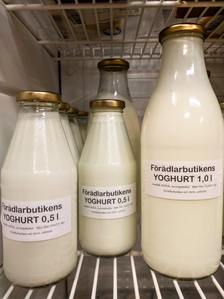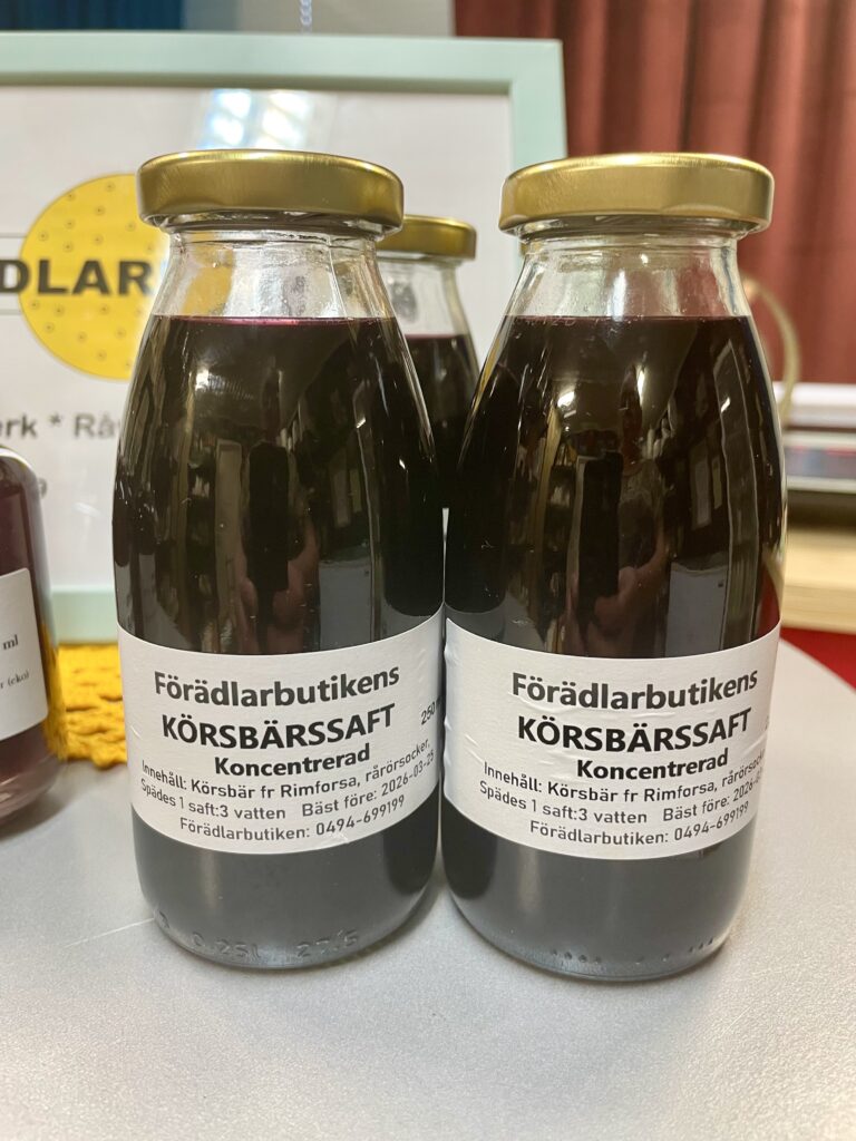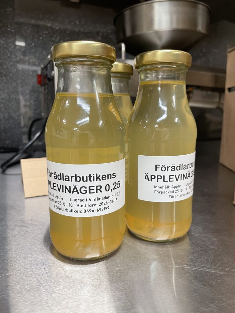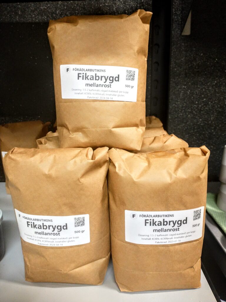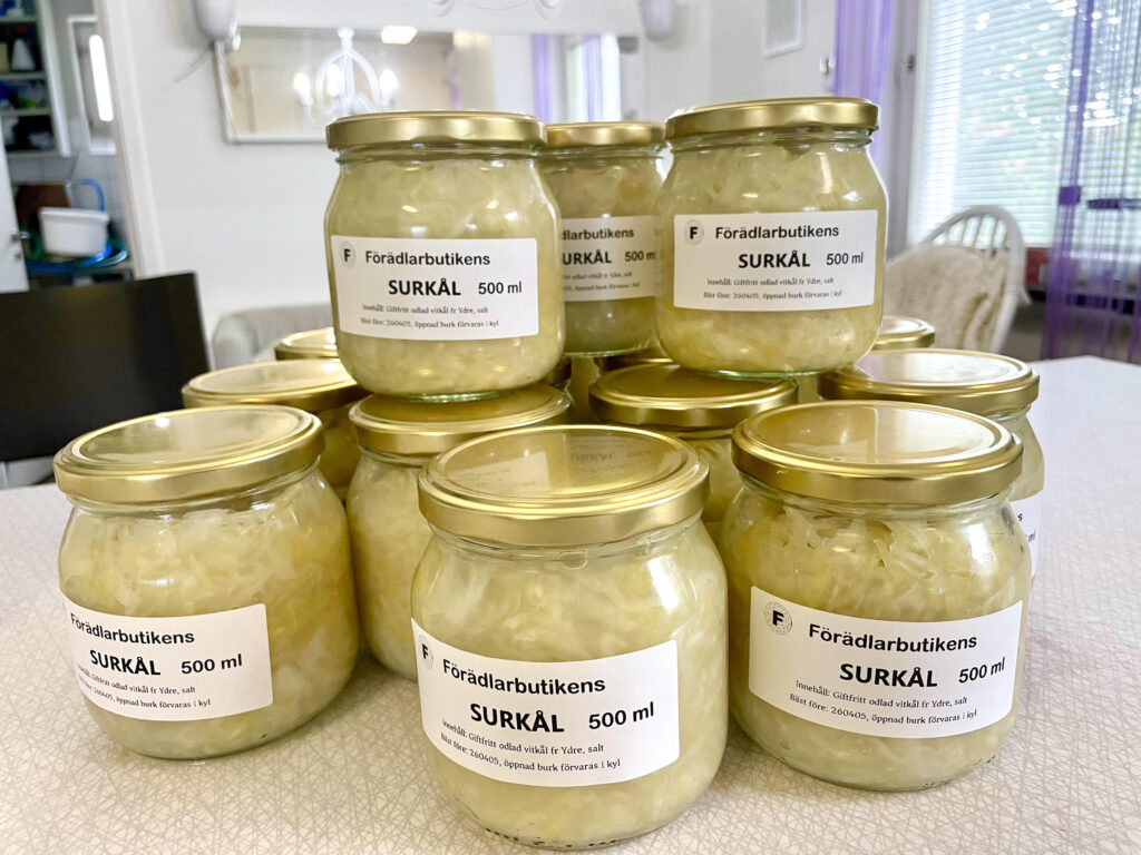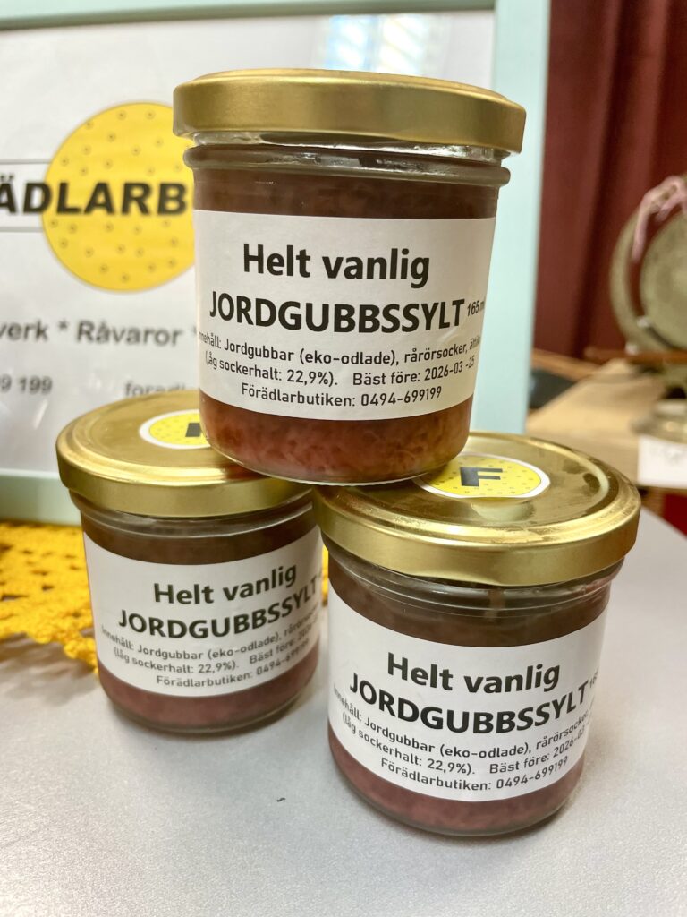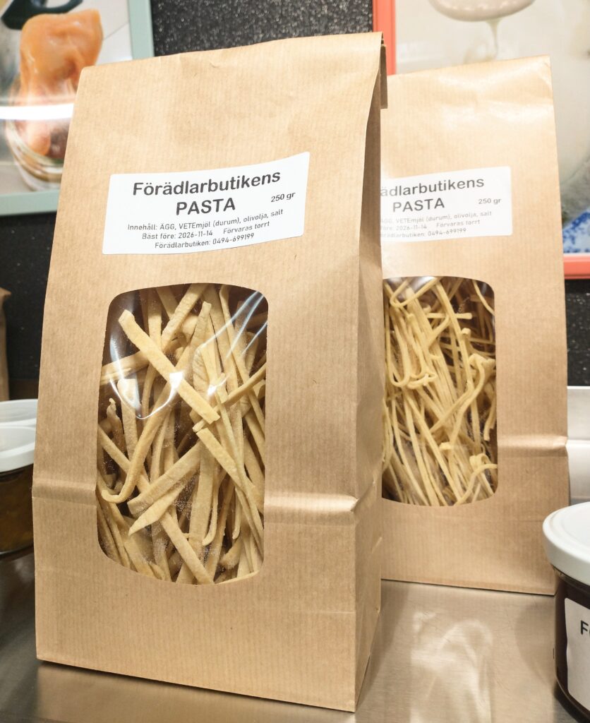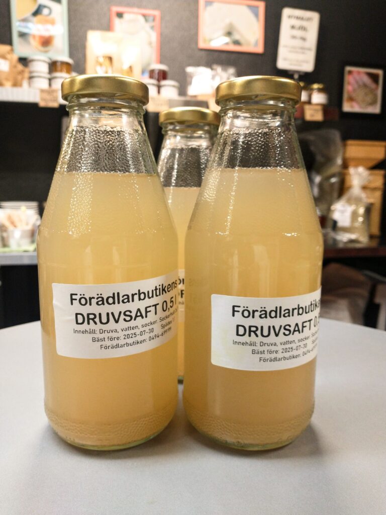 Vår goda ketchup är tillverkad av tomater från Varv i Motala. Ketchupen ska fungera som vanlig ketchup med alla dess användningsområden. Kryddningen är klassisk och enkel. Innehåll: Tomat, rårörsocker (ekologisk), ättika, kryddorkryddor. Yoghurten är gjord på mjölk från Tjärstad Boda Skattegård utanför Rimforsa, pastöriserad till 92 grader för krämig konsistens och sedan syrad med termofila mjölksyrebakterier. Påminner om långfil i känslan. Innehåll: MJÖLK, syrningskulturRosenkvitten plockade i Rimforsa. Rosenkvitten har en karakteristisk syrlig smak och passar bra till ost-och-kex. Innehåll: Rosenkvittenfrukt, rårörsocker (ekologisk)Vår saffranssirap har en svag smak av saffran och äpplemust, gott till pannkakor. Innehåll: Rårörsocker (ekologisk), äpplemust, saffranVår fikabrygd är till dig som vill slippa koffeinet och hitta en ersättning till kaffet. och är gjord av rostat korn. Vi har utvecklat en blandning av olika rostningsgrader för att få fram ett gott spannmåls-”kaffe”. Spannmål använde man som fikadryck förr när kaffe var en bristvara. Denna blandning bryggs i kaffebryggare med dosering 2 kaffemått per kopp. Innehåll: Rostat KORNVåra inläggningar är gjorda av grönsaker från giftfria odlingar i Östergötland/Rimforsa. Klassiska smaker av inlagda betor och smörgåsgurka. Innehåller utom grundråvaran: socker, ättika, ev kryddor.Vår pasta är tillverkad av ägg från Rimforsa och durumvetemjöl, inget tillsatt vatten. Den breda varianten passar till alla slags pastasåser och den smala är extra gott som nudlar i soppor och wok. Innehåll: Durumvetemjöl, ägg och lite saltVåra koncentrerade saftar är tillverkade av bär från trädgårdar i Kindabygden. Utbudet varierar med årstid och tillgång. Innehåll: Bär, ekologisk rårörsockerVår druvsaft är koncentrerad saft av egna druvor som är plockade efter frost för djupare naturlig sötma. Spädes 1 del vatten – 1 del saft. Innehåll: Gröna druvor, rårörsocker (ekologisk) Vår senap är gjord med vår egen äpplemust som vätska, vilket ger en pigg fruktighet i smaken. Den är grov och lagom sötad med honung och ekologisk rårörsocker och lagom stark. Råvaran är ekologiska senapsfrön från Skåne. Innehåll: SENAPsfrön, socker, honung, äpplemust, ättika, egen äppelvinägerVåra kryddblandningar av hela kryddor väger vi själva och blandar efter eget recept. De flesta kryddorna är ekologiska. Vi använder hela kryddor för att man ska kunna mala de färska när man lagar mat för kraftigare smak. Vi har följande blandningar: Curry, TexMex, Klassisk grill, italienska örter, brödkrydda Vår stekost är ystad på mjölk från Tjärstad Boda Skattegård utanför Rimforsa. Den är gräddig i smaken och inte överdrivet gnisslig. Går utmärkt att frysa och smälter inte på grillen. Ibland finns också ricottaost i butiken när vi gjort stekost. Innehåll: MJÖLK, löpe, syrningskultur, saltTanken med våra sylter av handplockade bär från Östergätland är att ta vara på råvarans egna smak och låta den glänsa. Vi experimenterar inte med olika kombinationer och krånglar inte till det, utan lingonsylten innehåller lingon och ekologisk rårörsocker och svart-vinbärssylten innehåller endast svarta vinbär och socker, endast två ingredienser. Vi använder inte heller syltsocker som innehåller syntetiska tillsatser (pektin, natriumbensoat) utan håller det rent. Vi håller även sockerhalten nere, ca 30% socker. Innehåll: Bär, ekol. rårörsockerVår fermenterade surkål är fräsch och knaprig i smaken, med fin lagom syrlighet, naturlig – inga tillsatta kryddor. Kålen kommer från ekologiska odlingar i Östergötland. Den fermenteras i okt-nov och behåller sin fina krispiga konsistens ända till mars-apr. Innehåll: ekologisk vitkål, salt.Vår jordgubbssylt är tillverkad av ekologiskt odlade jordgubbar från Tjärstad Boda Skattegård nära Rimforsa. Tillsatsfri och låg sockerhalt (ca 22%). Innehåll: Jordgubbar, ekologisk rårörsocker, ättikaVåra goda spröda digestivekex har vi skapat receptet för själva efter gamla beskrivningar om vad de skulle innehålla ursprungligen. Vi mäskar vört som bakvätska och maler själva gammeldags kulturvete odlad i Hasselås utanför Rimforsa. Kakorna har perfekt salt- och sockerbalans och fungerar fint till både ost-och-kex och till en kopp kaffe. Innehåll: Havregryn, kulturVETE Innthaler, vört av KORN, SMÖR, ÄGG, socker, saltTanken med vår goda sweet chilisås är att den ska kunna användas precis som den köpta, till kyckling, till wok mm, men har förstås godare och djupare smak än den industriellt producerade samt är tillsatsfri. Ursprunget till chilifrukterna, likaså styrkan i såsen, varierar beroende på årstid och tillgång. Innehåll: chilifrukt, ekologisk rårörsocker, vinäger, vitlök, majsstärkelseMjölksyrad opastöriserad äppelvinäger lagrad i 6 månader före flaskning, ner till pH 3,5. Mild, fräsch och lätt i smaken, passar till att ringla över sallader eller i vinägrett, eller bara ta en en liten sipp då och då. Eftersom den är opastöriserad så kan den användas som starter för egen ny vinäger. Innehåll: Äpple.Vi har alltid hembakta ciabattabröd i frysen som säljs i 4-pack, vetebrödet med lös deg och härligt luftig struktur. Innehåll: VETEmjöl, vatten, ekologisk olivolja, jäst, socker, saltJästlimpa av emmervete odlad i Hasselås, Rimforsa, med surdeg som smakhöjare. Innehåll: EmmerVETE, surdeg av emmerVETE, jäst, rapsolja, eko. rårörsocker, saltVi har alltid någon sorts sirap i sortimentet – rabarber, jordgubb, körsbär, beroende på årstid och tillgåmg. Sirapen är megagod att ringla över glass, våfflor eller pannkakor eller blanda i drinkar. Den har kvar syrlig smak av respektive råvara och är inte överdrivet söt. Naturligtvis kokar vi vår sirap alltid på ekologisk råvara från närområdet. Innehåll: Bär/fruk